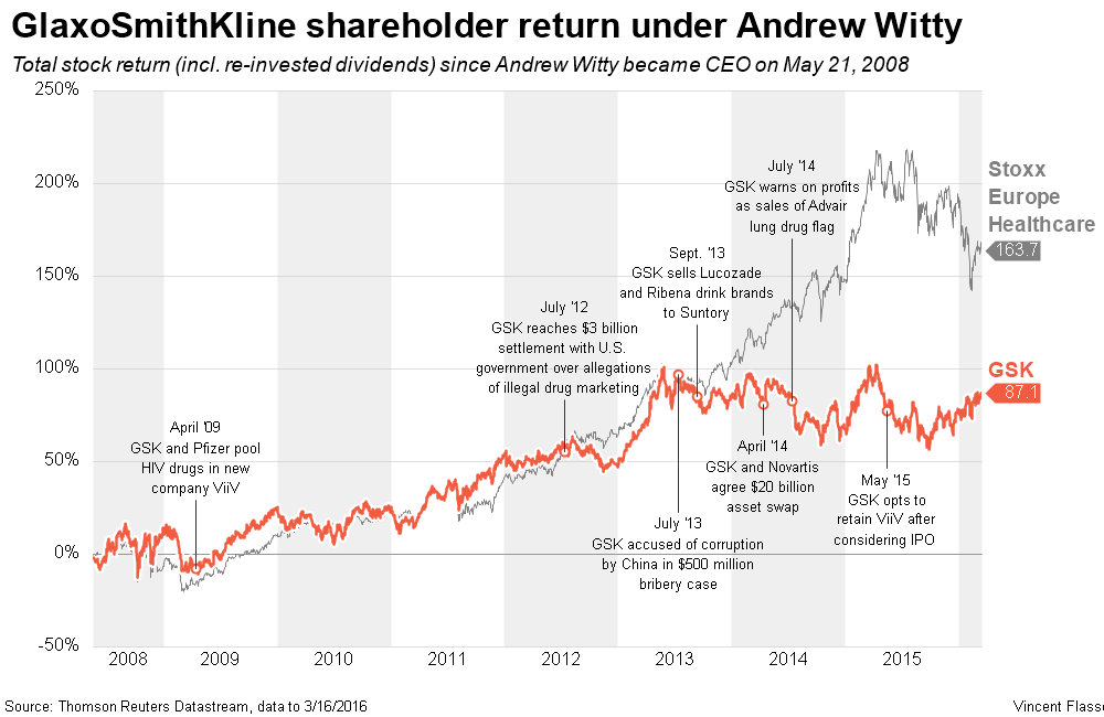 新聞事件】在受主要投資者質(zhì)疑一年多時間以后,今天葛蘭素少帥Andrew Witty爵士宣布將在明年3月退休。現(xiàn)在葛蘭素的CFO Simon Dingeman、諾華制藥業(yè)務(wù)負責(zé)人David Epstein等被列為下屆CEO諸多候選人之一。2014年中國賄賂門后就有大股東嘀咕讓W(xué)itty讓位,去年更是公開化,雖然董事長出面支持Witty。今年年初葛蘭素最大股東之一,對沖基金Och-Ziff資本甚至給出最后通牒,要求今年第二季度之前得到明確計劃。Witty退休的消息令葛蘭素股價今天上揚近2%,為數(shù)月來最高單日漲幅,反映投資者對高層變動的期待。