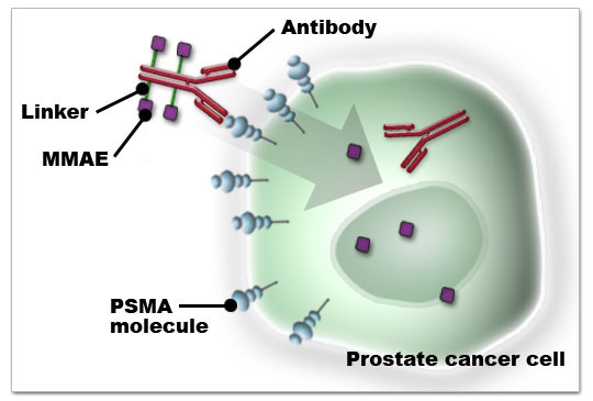 PSMA ADC是采用西雅圖遺傳公司的抗體藥物偶聯(lián)物技術(shù)制備的ADC藥物,把靶向前列腺特異性膜抗原(PSMA)的單克隆抗體和MMAE連接起來。鑒于PSMA ADC一期臨床的積極結(jié)果,Progenics在2012年九月開始一個開放標(biāo)簽、多中心的二期臨床實驗,預(yù)計注冊75位轉(zhuǎn)移性閹割難治性前列腺癌患者。觀察終點包括療效、PSA和CTC值變化、疼痛以及安全性。