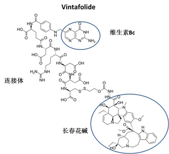 眾所周知,常規(guī)的ADC(antibody drug conjugate)是利用單克隆抗體的高度專一性來將超強(qiáng)抗腫瘤藥輸送到腫瘤細(xì)胞中,從而殺死腫瘤細(xì)胞而不影響正常組織。但是,Indiana的Endocyte Co.發(fā)明了另一種強(qiáng)有效的藥物共扼體 Vintafolide。其原理相當(dāng)簡單:就象常規(guī)的ADC一樣,它有一個(gè)活性很強(qiáng)的抗腫瘤藥(彈頭)和一個(gè)連接體。與常規(guī)的ADC不同的是,Vintafolid的引導(dǎo)體是一個(gè)水溶性的維生素Bc(一個(gè)小分子), 而不是單克隆抗體。 這是因?yàn)樵谟行┕腆w腫瘤細(xì)胞中維生素B受體的含量很高。這些腫瘤細(xì)胞在快速分裂和增長時(shí)需要大量的維生素B。卵巢癌就是其中一例。Vintafolide已經(jīng)完成了一個(gè)臨床2期實(shí)驗(yàn)。它對(duì)抗藥性的卵巢癌顯示了極好的療效。正因?yàn)槿绱耍绹扑幘揞^Merck Co. 花了十億美元買下了這個(gè)藥物來做進(jìn)一步的臨床實(shí)驗(yàn)以檢測(cè)它對(duì)別的固體腫瘤是否有效。