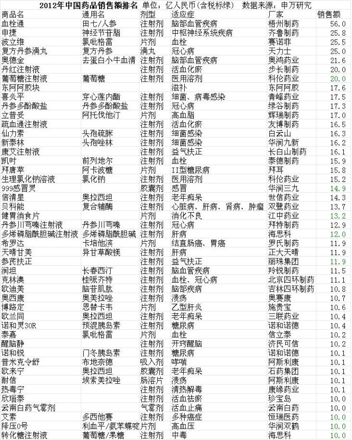 2012年單個(gè)藥物銷(xiāo)售額前50名榜單: