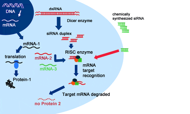? RNA干擾(RNA interference,縮寫為RNAi),也稱為轉(zhuǎn)錄后基因沉默(post-transcriptional gene silencing,PTGS)是通過雙鏈RNA阻礙特定基因的翻譯或轉(zhuǎn)錄的一種基因沉默現(xiàn)象。當(dāng)細(xì)胞中導(dǎo)入與內(nèi)源性mRNA編碼區(qū)同源的雙鏈RNA時(shí),該mRNA發(fā)生降解而導(dǎo)致基因表達(dá)沉默。