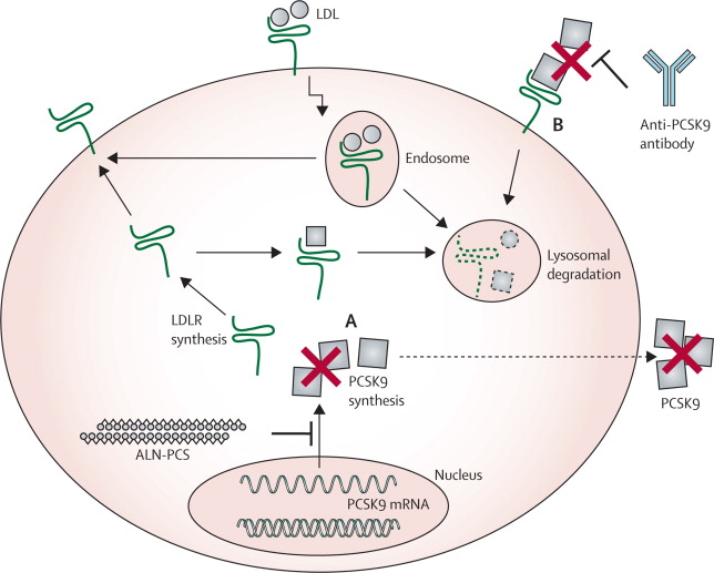 抗PCSK9抗體是最直接也是最常見(jiàn)的下調(diào)PCSK9水平的手段,其中Regeneron和賽諾菲的Alirocumab是抗PCSK9單抗領(lǐng)域的領(lǐng)頭羊。一個(gè)小型的三期臨床結(jié)果表明,患者每?jī)芍茏⑸湟淮?5毫克alirocumab,24周后能使低密度脂蛋白膽固醇的水平降低47.2%,幾乎是依折麥布(Ezetimibe,商品名:Zetia)對(duì)照組的三倍(15.6%)。另一個(gè)方法是通過(guò)RNA干擾,,在上游下調(diào)PCSK9的表達(dá)。英國(guó)蓋氏醫(yī)院研究人員與美國(guó)同行一起,10月3日在《柳葉刀》雜志上在線報(bào)道一個(gè)靶向PCSK9的干擾核糖核酸ALN-PCS,可通過(guò)干擾核糖核酸來(lái)抑制PCSK9基因的表達(dá),使身體清除有害膽固醇的能力恢復(fù)正常。這是首次披露的采用RNA干擾靶向PCSK9的臨床實(shí)驗(yàn),這項(xiàng)研究再次證實(shí),基因技術(shù)可為開(kāi)發(fā)有效、低副作用的新型藥物提供新希望。