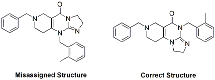 斯克里普斯研究所的Kim D. Janda及同事發(fā)現(xiàn)按照專利公布的化合物結(jié)構(gòu)合成的化合物沒有顯示相應(yīng)的生物活性,但是從NCI公用化合物庫獲得的化合物卻表現(xiàn)活性。為此該研究團(tuán)隊(duì)通過X-光衍射和全合成重新鑒定了這個(gè)化合物,并為正確的化學(xué)結(jié)構(gòu)(見上圖右首結(jié)構(gòu)式)申報(bào)了專利。