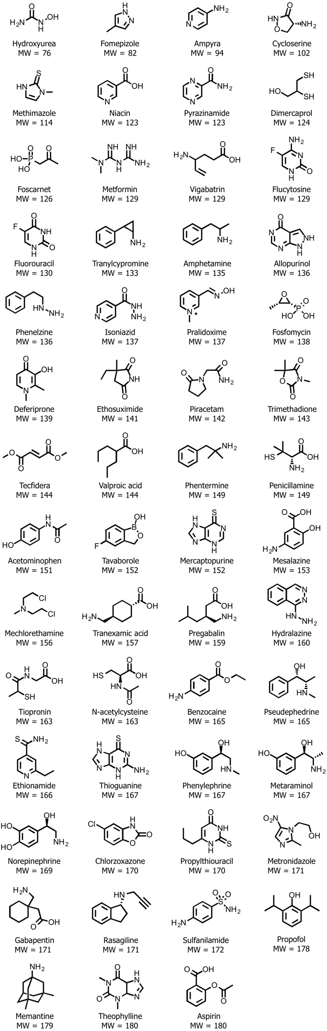 首先這些分子或者有反應(yīng)中心可以不可逆與蛋白質(zhì)結(jié)合,或者有所謂的核彈頭(warhead)如磷酸和羧酸。磷酸和羧酸如果位置恰當(dāng)比其它基團(tuán)能提供多得多的結(jié)合自由能。這兩個(gè)因素使這些藥物雖然很小、很簡(jiǎn)單但可以有超出一般的結(jié)合能和活性。其次,不少藥物是內(nèi)源性物質(zhì)的類似物,尤其是芳香乙胺衍生物和多巴胺、5羥色胺十分類似。而這些神經(jīng)遞質(zhì)受體通過進(jìn)化可以和非常簡(jiǎn)單的分子以高強(qiáng)度結(jié)合,所以這些分子雖然小,但屬于皇親國(guó)戚,仍然對(duì)某些受體有很高活性。第三,除了上述兩種較特殊情況,一般分子量這樣小的分子活性確實(shí)要低一些,但問題是這些分子和其它的蛋白結(jié)合也同樣或者更低,所以選擇性不一定差。只要水溶性好(大部分水溶性極好)增加劑量就可以解決療效問題。除了個(gè)別藥物外我估計(jì)大部分在這個(gè)單子里的藥物都需較高劑量(>1克)。最后,有些藥物是短期急性用藥,如解毒藥。危機(jī)時(shí)刻雖然有點(diǎn)副作用問題也不大。