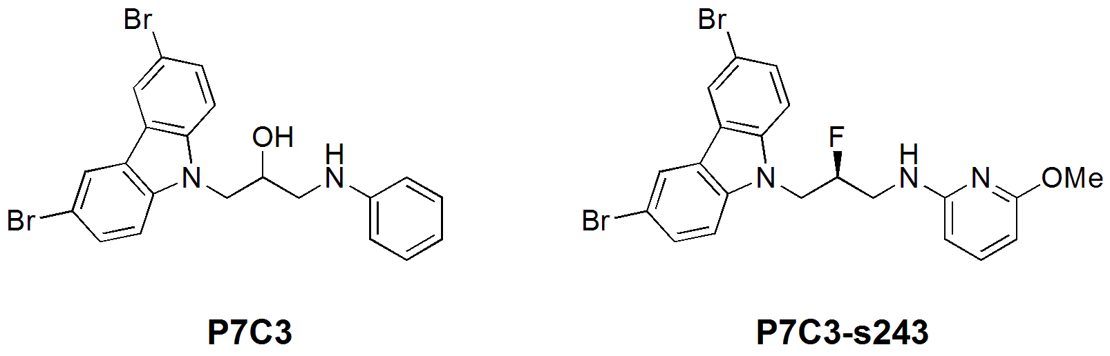 2. Naidoo J,De Jesus-Cortes H, Huntington P, Estill S, Morlock LK, Starwalt R, Mangano TJ, Williams NS, Pieper AA, Ready JM. “Discovery of a neuroprotective chemical, (S)-N-(3-(3,6-dibromo-9H-carbazol-9-yl)-2-fluoropropyl)-6-methoxypyridin-2-amine [(-)-P7C3-S243], with improved druglike properties” J Med Chem. 2014 May 8;57(9):3746-54.
