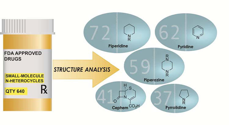 9月25日,美國化學會出版的藥物化學雜志(J Med Chem)接受了Jon Njardarson的文章,把小分子化學藥到底應(yīng)該長什么樣子的問題應(yīng)用到美國FDA歷年來批準的所有藥物。分析了這些上市藥物結(jié)構(gòu)的多樣性、取代模式,以及含氮雜環(huán)化合物的頻率。結(jié)果發(fā)現(xiàn),有59%的藥物分子含有至少一個氮雜環(huán)結(jié)構(gòu),并且列舉了最常見的25個氮雜環(huán)化合物。Njardarson課題組分析了美國FDA自成立以來到2012年為止批準的所有1994個上市藥物,刨去其中146個生物藥,253個復(fù)方制劑而且單獨組分從沒有被批準過的,23個多肽類藥物,還有537個重復(fù)的分子結(jié)構(gòu)。所以真正新小分子實體(NME)只有1086個。而這些化合物中有613-640個含有至少一個氮雜環(huán),占上市藥物總數(shù)的59%。