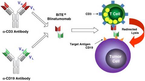 【藥源解析】: Blinatumomab源自一種叫做BiTE?(雙特異性T細(xì)胞連接蛋白)的技術(shù)。這種蛋白可以同時和T細(xì)胞和癌細(xì)胞結(jié)合,令T-細(xì)胞可以選擇性接近癌細(xì)胞而達(dá)到選擇性利用T-細(xì)胞殺傷力的治療效果。Blinatumomab自己可以同時識別T細(xì)胞和表達(dá)CD19的癌細(xì)胞。雖然現(xiàn)在只是申請較小的Ph-ALL適應(yīng)癥,但目前已經(jīng)獲得CLL, MCL等多個血液癌癥的孤兒藥資格并在臨床實(shí)驗(yàn)中。Blinatumomab是由Micromet所發(fā)現(xiàn),后者于2012年被安進(jìn)以12億美元收購。