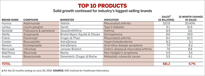 本期的C&EN News總結(jié)了今年制藥工業(yè)的一些事情。其中包括2013年6月至2014年6月這一年間世界銷(xiāo)售前10名的藥物(見(jiàn)表),其中質(zhì)子泵抑制劑Nexium(耐信)和HMGCoA還原酶抑制劑Crestor(可定)分別銷(xiāo)售79和83億美元,而且比上一年分別增長(zhǎng)8.2%和5.1%。支付部門(mén)一方面抱怨Sovaldi這樣顛覆性藥物價(jià)格太高,一方面卻花162億美元買(mǎi)價(jià)值10億美元的產(chǎn)品。