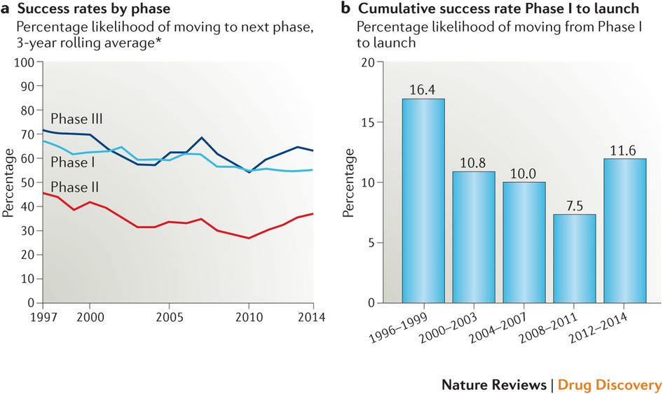 【新聞事件】:今天《Nat. Rev. Drug Discov.》發(fā)表一篇麥肯錫分析家撰寫的一篇文章,回顧1996-2014這近20年間新藥研發(fā)成功率的變化。從1996至2011年,新藥研發(fā)成功率逐年穩(wěn)步下降,2008-2011年三年平均成功率是1996-1999三年平均成功率的一半不到(7.5%對(duì)16.4%),但自2011年后開始反彈,現(xiàn)在已高于2000年時(shí)的成功率。主要驅(qū)動(dòng)因素是小分子藥物這些年間下降幅度巨大(從16%降到5%),而生物大分子則成功率相對(duì)平穩(wěn)。另一個(gè)保持恒定的趨勢(shì)是合作開發(fā)項(xiàng)目成功率高于單獨(dú)開發(fā)項(xiàng)目,過去5年合作項(xiàng)目三期臨床是單獨(dú)開發(fā)項(xiàng)目成功率的2倍。說明能被兩家看上的項(xiàng)目的確質(zhì)量略高。